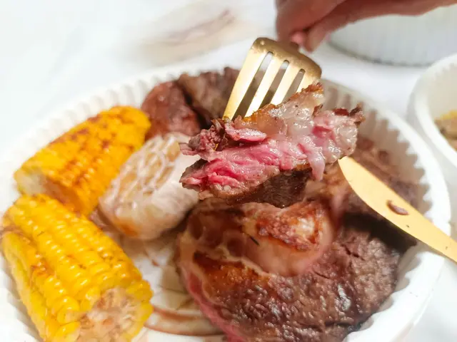特製香料厚切美國肋眼牛排18OZ,一旁搭配上烤蔬菜/馬鈴薯還有玉米