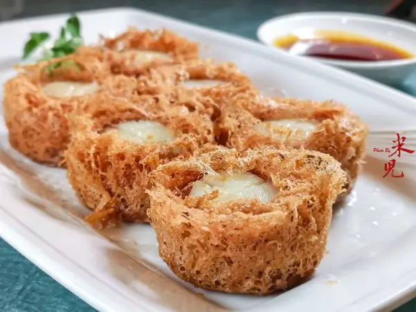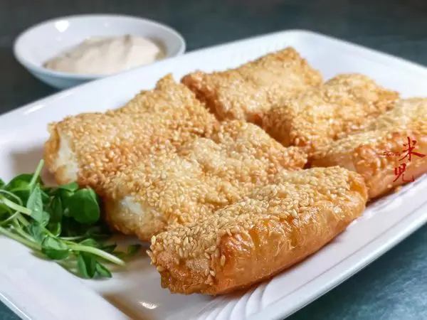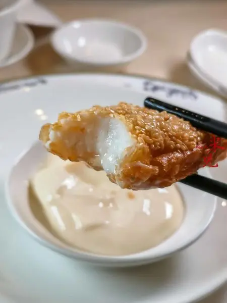 蘇東油條,398大洋。粵菜傳統鬼馬油條的變化型,以花枝漿取代百花餡,沾上白芝麻後油炸而成,吃的時候沾上蛋黃美乃滋醬,花枝漿的彈牙口感讓人印象深刻。
