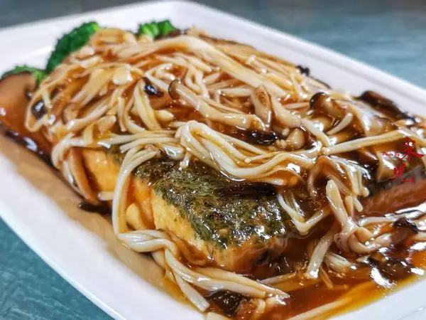 翡翠豆腐,368大洋。看到這道菜我忍不住笑了,因為來自新加坡的葉志光師傅教我做過這翡翠豆腐,我也把做法放在我的食譜書裡,這翡翠豆腐炸好後搭配以百菇做的澆頭,又是另一種好滋味。