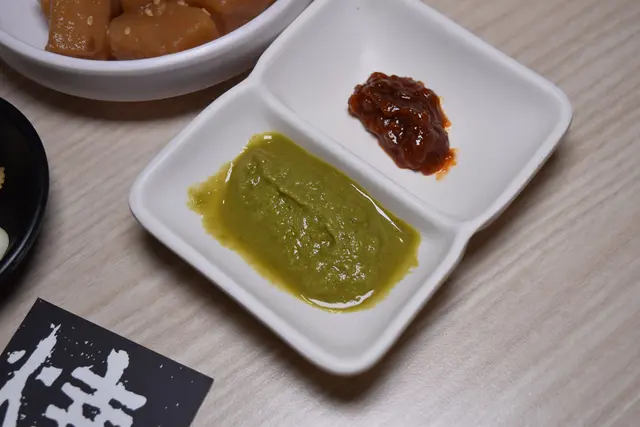隨桌每人都會有一疊雙色沾醬.左手邊是店家自製的青醬.右手邊是韓國辣醬