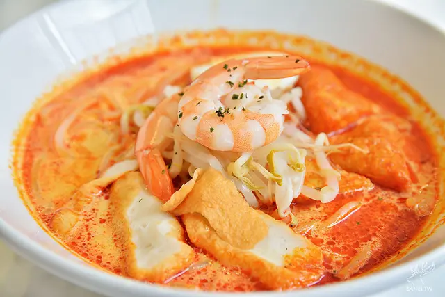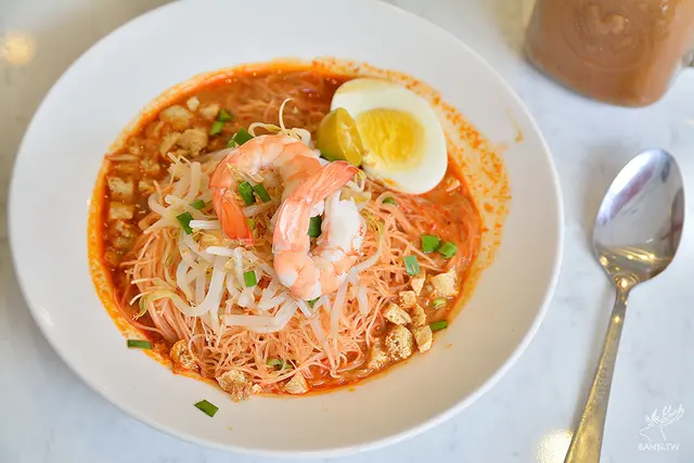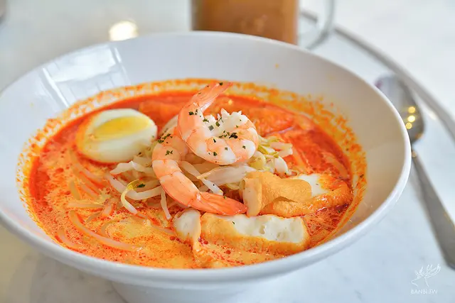 土司工坊的叻沙是使用帶有透明感的米線,搭配魚漿製品、豆芽菜、豆包、半顆水煮蛋、兩尾剝殼蝦,叻沙味道香辣帶有椰漿滑順濃郁口感,湯頭也不錯,但米線比較不容易吸附湯汁味道,新加坡道地的吃法是要用湯匙舀著粗米粉跟湯一同入口