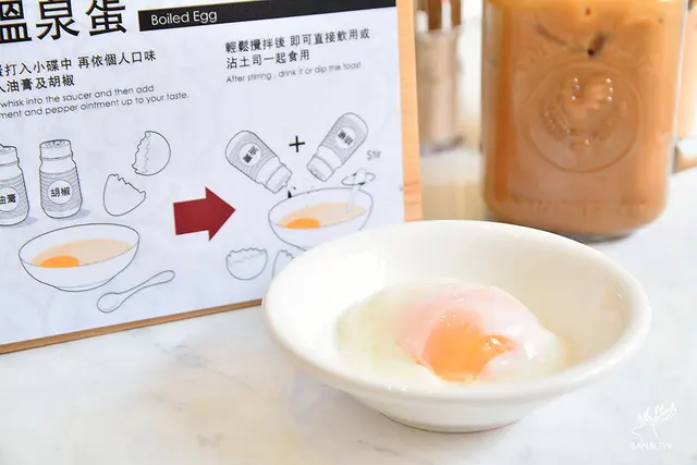 無論是單點溫泉蛋或是點選吐司套餐附半熟蛋,可以加上醬油、胡椒一塊食用。