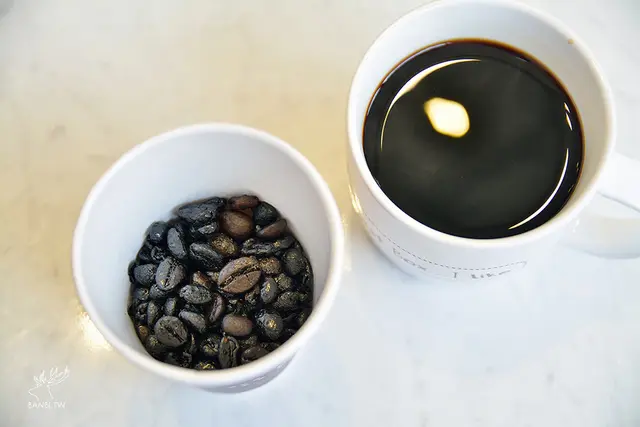 店內人員給我看咖啡豆,是亮黑色的,一開始在製作時會用糖炒,所以帶點甜味!