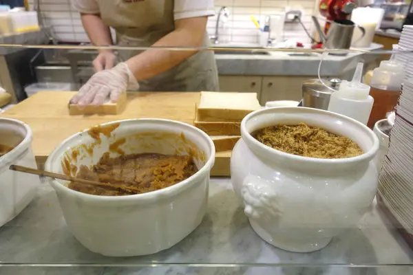 店員正勤快地把厚片吐司切邊備料,大桶的咖椰醬好震撼啊!!!!