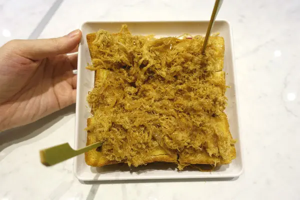 正常size的厚片方形土司,上面鋪滿看不到縫隙的閃亮肉鬆絲,好香啊~~