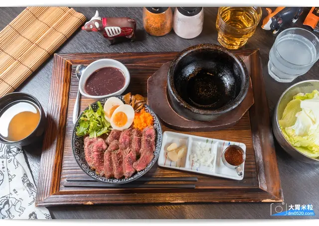 特別使用嫩肩牛排部位,特別煎到三分熟度,上桌搭配燙熱的厚釜石鍋,