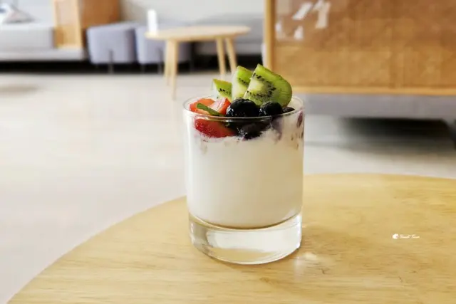 優格杯上面會搭配三樣新鮮水果,底下再加上一層微甜穀物,和無糖優格搭配很剛好,清爽可口。