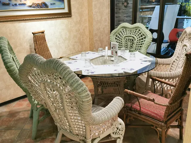 門口旁的是一張六人圓桌,搭配著不同色系的藤椅