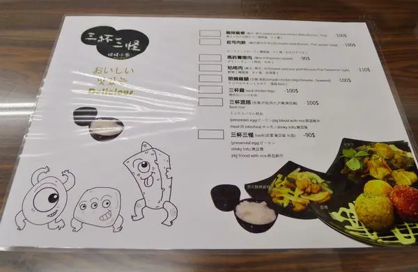 三杯三怪的餐點價位落在90-110之間.每個人低消40元