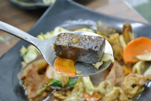 除了將之威猛之外.食材的挑選也很重要.豬血糕吃起來彈性.還能充分感受到糯米的顆粒感
