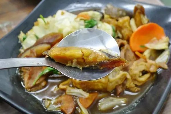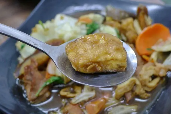 臭豆腐氣孔很多.口感卻出乎意料的扎實.而且每一口都會有爆漿的三杯醬汁爆出.味道出乎意料的濃郁