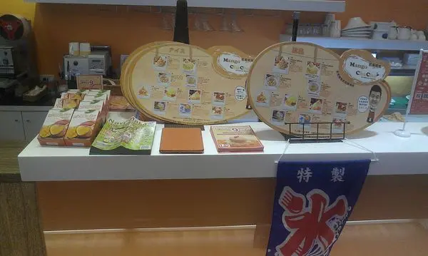 在櫃檯的地方有擺放店家特製的菜單,也是做成芒果的形狀,上面還有各種產品的圖片和簡介,可以提供給客人做參考!