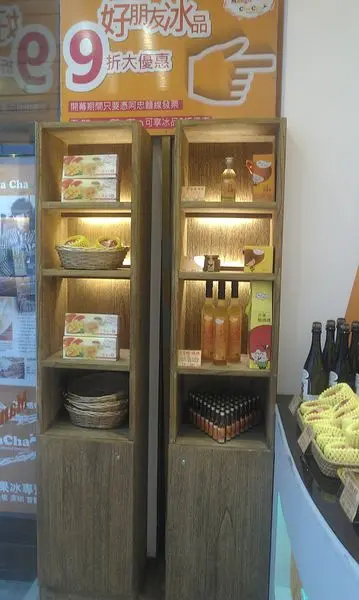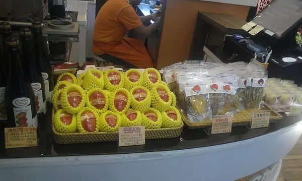 店加運用芒果製作了很多的周邊產品,有芒果酒 & 芒果醋 & 芒果香皂 & 芒果乾 & 芒果面膜,這些芒果產品很整齊的陳列在產品架上。