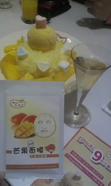 這是這次的我們購買的有一碗金牌情人雪花冰 & 一小杯的芒果甜酒 & 一片面膜!
