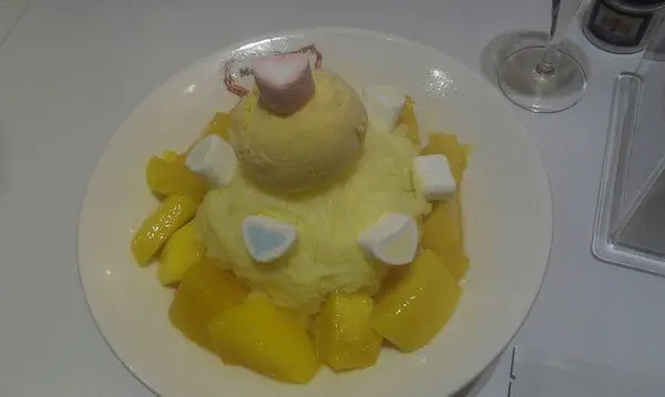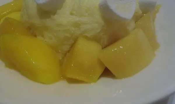 金牌情人雪花冰 上面有一球芒果冰淇淋,吃起來芒果味道很濃郁,冰淇淋的口感很綿密,雪花冰吃起來芒果的味道就比較淡一點點,芒果吃起來很新鮮,有一點點微酸,酸酸甜甜的很好吃!