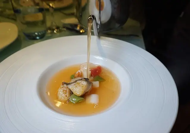 清湯滾熱後,就會在桌邊淋上湯頭,海鮮的油脂瞬間釋放出來,湯底是番茄口味,清淡甜美。
