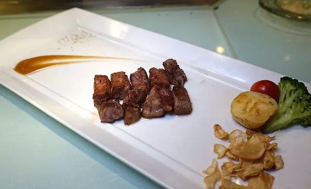 主廚還提供另一種口味,加入起司片在鐵板上炙燒,起司與伊比利豬融為一體,滿滿的油脂在嘴裡擴散開來,