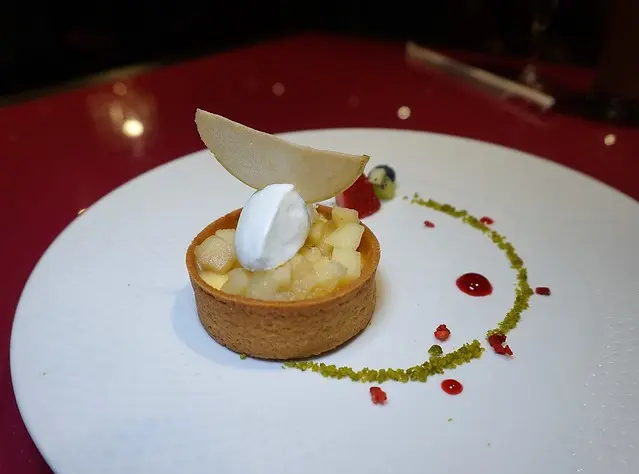 酥香的塔皮搭配上卡士達內餡,香甜滑口,上頭是蜜蘋果微脆又多汁,本來以為白色是香草冰淇淋,