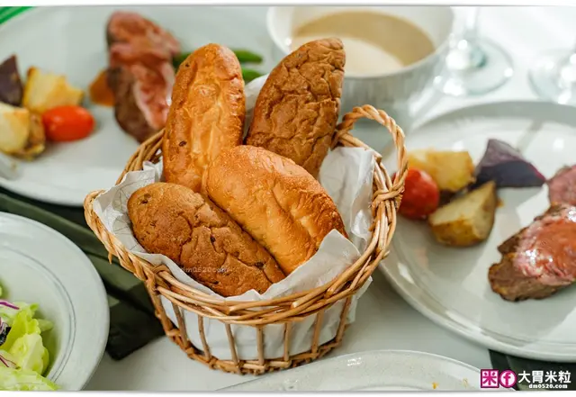 雙人套餐內容包含雅室牛排精選麵包兩份(四入)/鮮蔬萵苣沙拉/