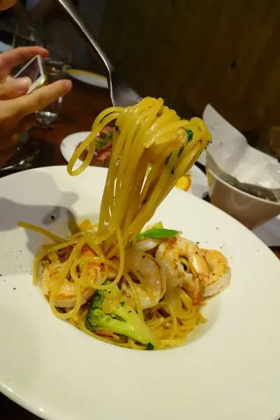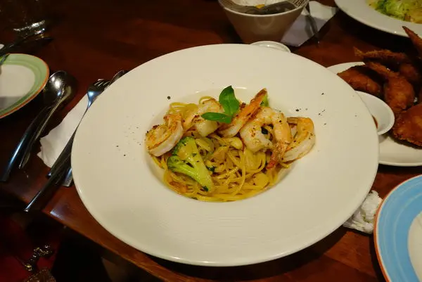 蒜味雞汁清炒細扁麵佐炙燒白蝦 NT$360