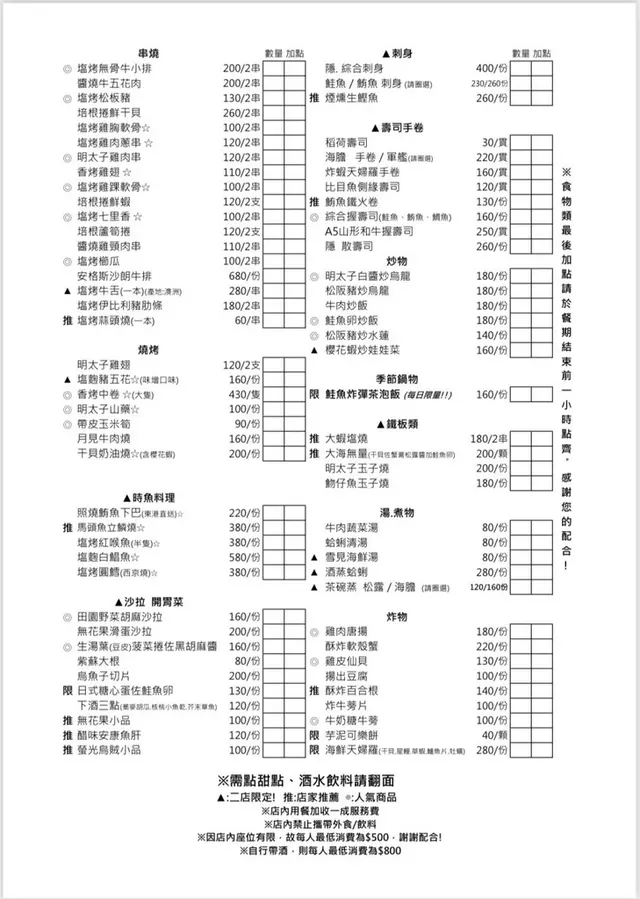 二店多了生食、壽司隱藏版菜單
