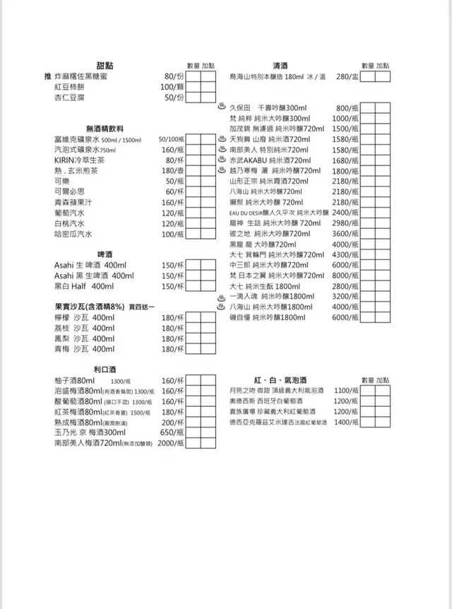 店內座位有限,每人低消$500 自帶酒,每人低消$800 加收一成服務費。 ▼清酒的選項豐富,我很滿意。
