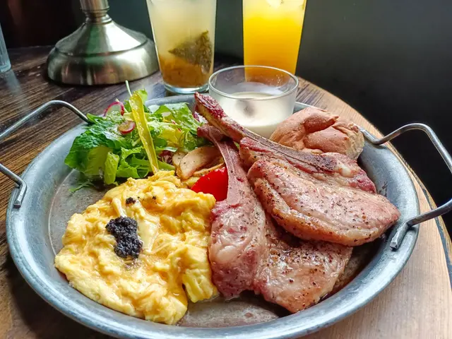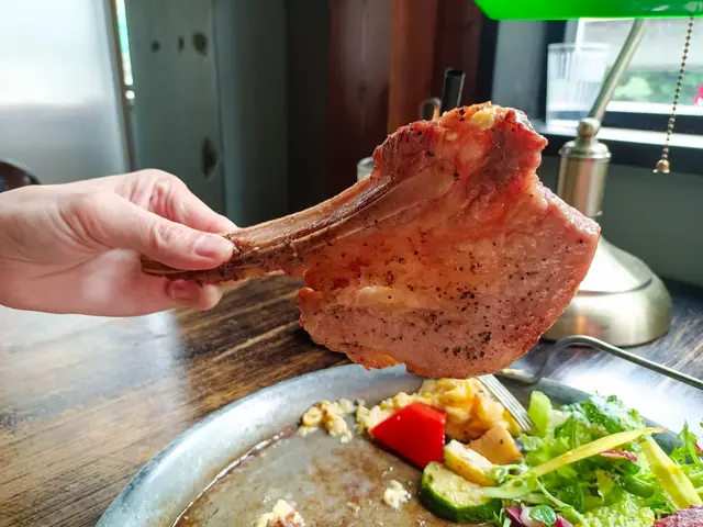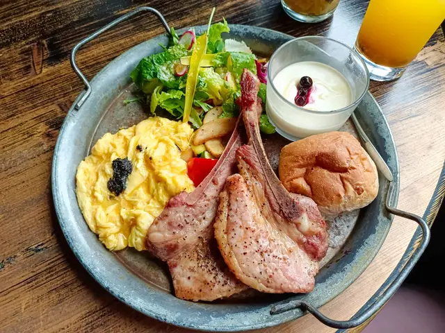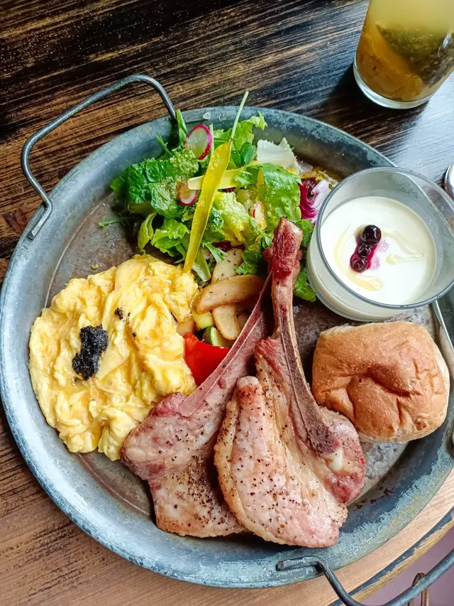 二大塊小豬戰斧,松露炒蛋,堅果麵包,薯塊,沙拉與奶酪再加上一杯飲料