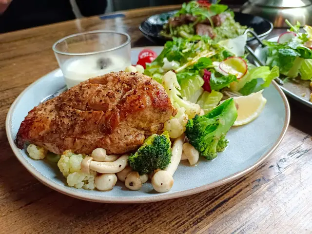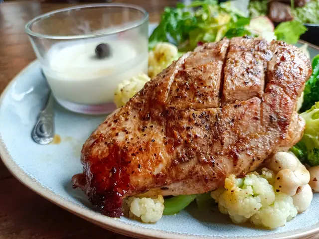 一大塊香料雞胸肉再加上大量的炒蔬菜與沙拉,甜點奶酪一杯