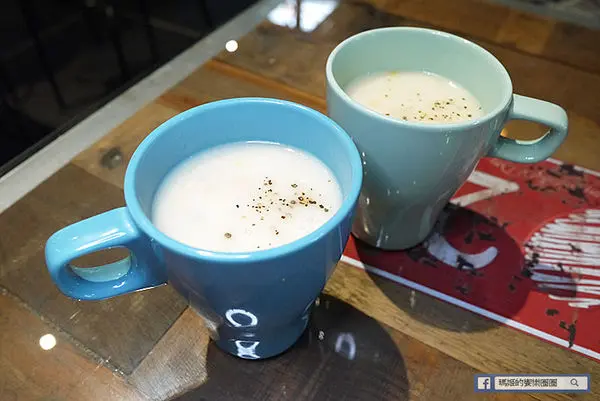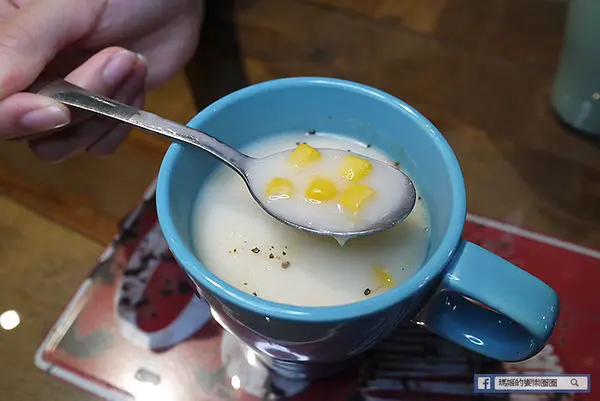 排餐、義大利麵、燉飯和漢堡皆附湯品,另外也可以加120元升級為套餐,會增加沙拉、奶油餐包和甜點。今天提供的是玉米濃湯,用杯子裝湯可以輕鬆喝,我還蠻喜歡用杯子喝湯的感覺。