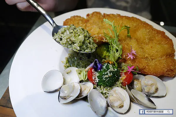 這阿根廷大花枝再配上雲林蛤蠣和松子青醬燉飯,還點綴上綠花椰和蕃茄及食用級彩色小花,看起來美味度十足!