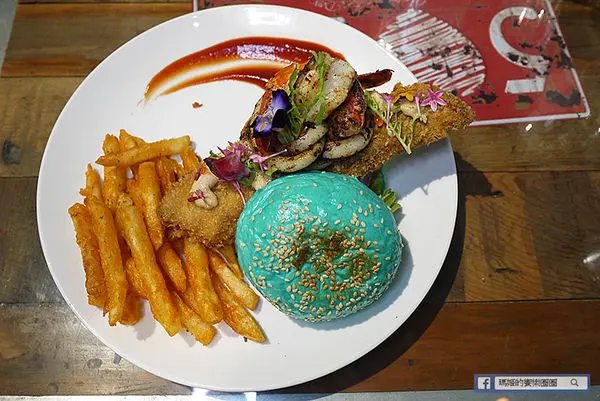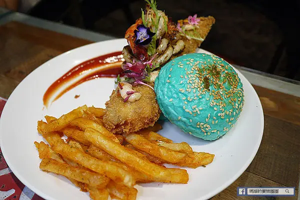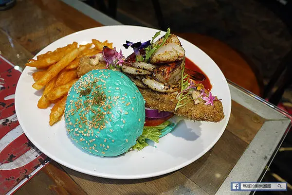 華麗珍珠美人魚漢堡298元,這也是藍色海洋傳說新品系列的主打料理,看到和海洋飲品一樣的海洋藍色漢堡包,讓人胃口大開。