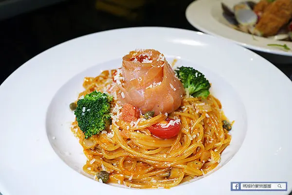 粉紅醬•鮭魚玫瑰花義大利麵268元,這外型也很吸引人,一大朵煙燻鮭魚玫瑰花是這道義大利麵的重點。