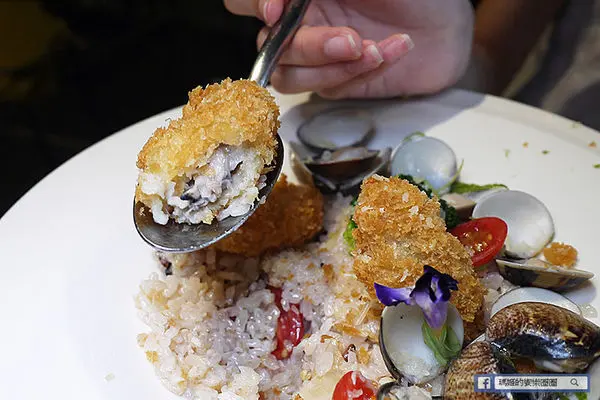 痛風炸牡蠣海鮮•檸檬奶油燉飯268元,這又是一道極品海鮮燉飯,上面對廣島牡蠣和雲林蛤蠣,滿滿的蓋住整個燉飯。