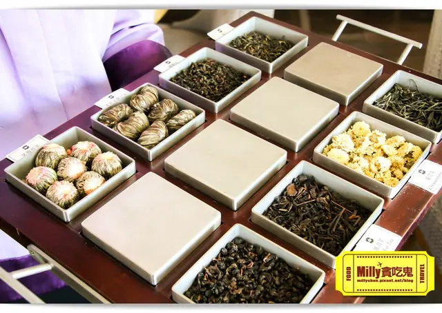 上頭許多茶種:鐵觀音、菊花、普洱,最受推薦是茉莉芙蓉花茶與芙蓉花茶!