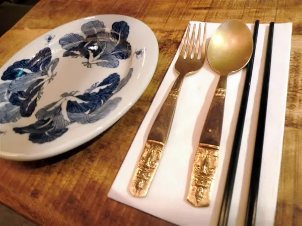 有點青花瓷風格的餐盤和金色餐具都很令人喜愛