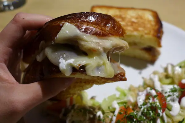 從麵包邊緣縫隙超大方地順勢而下,起司就這麼地吊在半空中,好犯規!!!!