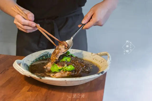 梅干扣肉也是道地的客家代表菜色之一,夫妻檔捨去了大多數人在製作這道料理時所使用的五花肉,選用了油脂較少的豬肋排,讓整道梅干肋排吃起來不會太過油膩;肉質被燉煮得非常軟嫩,桌邊服務時輕巧地以湯匙和筷子就能撥散分裝。