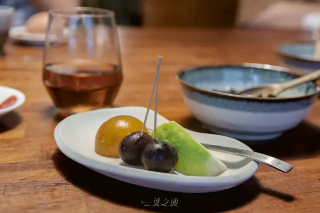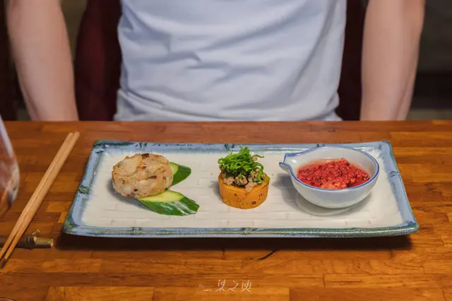 接著送上三道前菜,前菜的擺盤方式讓我想起了在吃日式懷石料理中,最先上桌的「八寸」,讓前菜打先鋒,表現出當季食材或餐廳的餐點特色。我想這三道前菜,之於夫妻檔來說也有著這樣的作用吧。