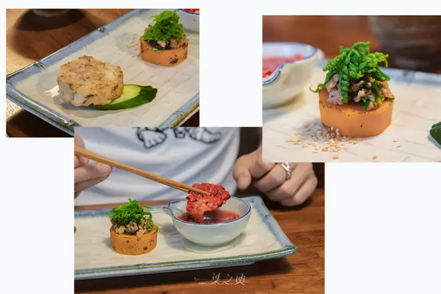 以麻油煎過的手工花枝餅外層帶有脆口感,咬下後內裡的花枝Q彈鮮甜,口腔裡帶著麻油香氣,豐富得讓人忍不住闔眼;鬆軟的地瓜上放上豬絞肉和帶有滑溜感的過貓,口感層次豐富多元;自製紅麴松阪豬醃漬得「鞭辟入裡」,紅麴的獨特風味濃郁、松阪豬肉相當彈脆。