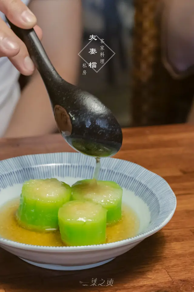 同樣也是被稱作夫妻檔招牌菜色之一的清蒸蒜蓉絲瓜,吃上一口立刻可以懂得為什麼會是招牌:使用蒸煮後不易過於軟爛的角瓜,上頭鋪著蒜泥,一起蒸煮的汁液為破布子汁。