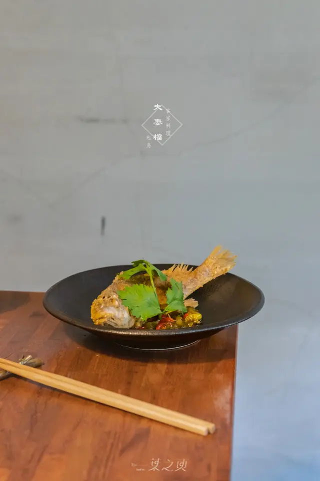 對海鮮料理並不特別鍾愛的我,在酥炸小黃魚上桌時只驚嘆於其擺盤美感,整隻黃魚像是在酸菜醬上躍動,還保留著栩栩如生的姿態。