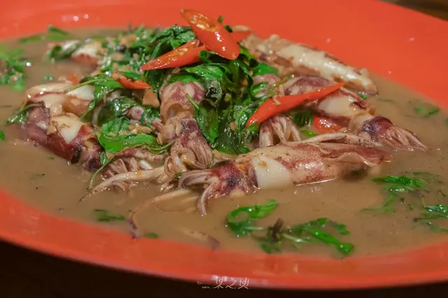 兩道熱炒料理更加能體現廚師的功力,炒水蓮和菇類一起炒,保持著蔬菜本身水潤及脆口感,整體規矩不過不失,但倒也沒什麼好挑剔的。而主人特別招待的炒現流小卷,再次讓大家連連稱讚,雖然看似調味濃重,但其實鹹淡得宜,爆出九層塔的香氣、也吃得出小卷特別鮮甜的肉質。
