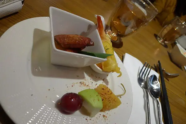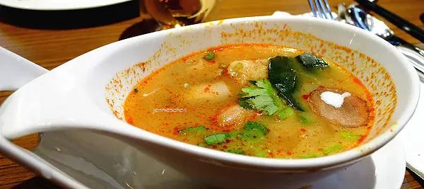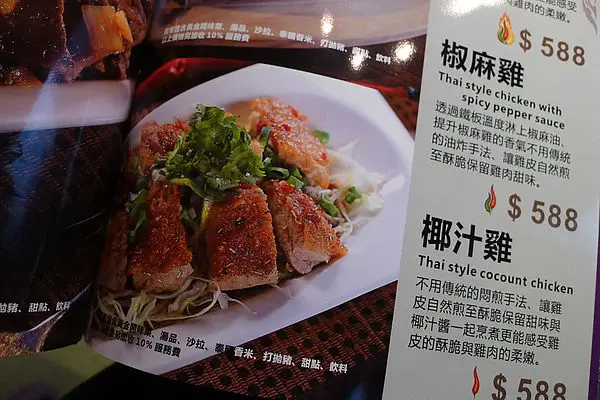點法跟王品的很像。有前菜、湯品、沙拉、主菜、甜點及飲料。價格從588元起跳(含一成服務費用)。我點了泰式椒麻雞套餐。