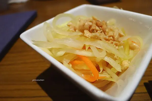 入坐後會送上涼的薄荷茶或是熱的香矛茶,並且附上涼拌青木瓜絲。吃起來味道酸酸鹹鹹的,口感普通,但居然有人說像餿水的味道。其實還不難吃啦!