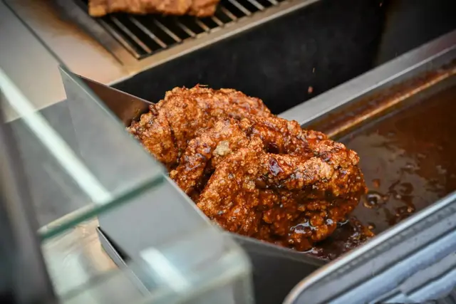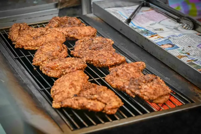 外面有些雞排是直接烤的,沒有經過炸的過程。吃起來有濃濃的碳燒風味,但肉質可能會稍微偏乾。另外,有些雞排是先炸後烤的,外皮裹上醬汁。如果這個過程沒有做好,醬汁可能會使雞排的外皮變得濕軟,導致炸過的脆皮剝落。這邊賣的雞排大多是這種炸後再烤的方式,醬汁用量恰到好處,外觀上仍保有炸雞排的感覺,並帶有烤過的特色痕跡。