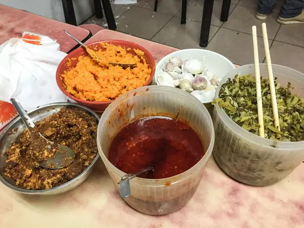 傳統吃牛肉麵的好朋友都在這:酸菜、辣椒醬跟牛油,這邊的牛油還有分普通跟辣味兩種口味,