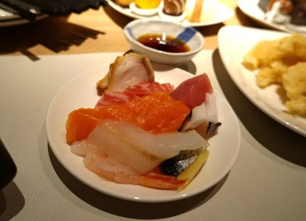 熱食區的旁邊就是生魚片區很小一塊,不過手卷 握壽司 生魚片應有盡有! 剛開始三位師傅忙著,最後變一位,辛苦了師傅們