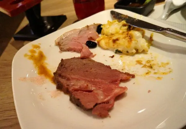 現切牛排跟豬排,搭配海鹹就很鮮甜,軟硬度適中 一旁是熱炒區的焗烤香料飯,非常好吃,味道很喜歡