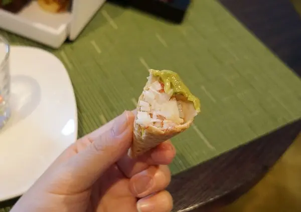 迷你脆口的甜筒,濃郁的酪梨醬吃起來很清爽,還有鮮甜的蟹肉,最後新鮮芒果作為完美ending,