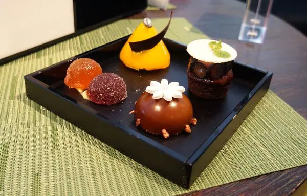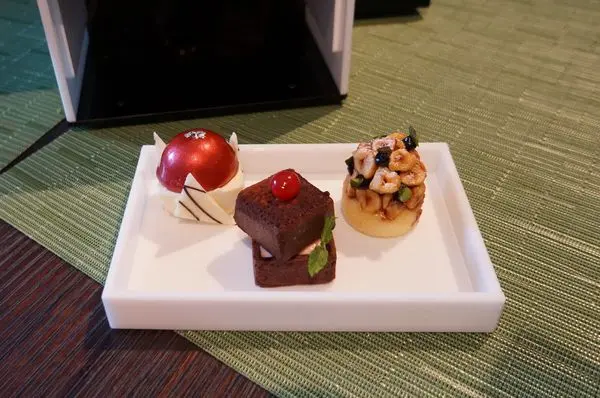 尼昂寶巧克力紅酒布蕾(中間) 以尼昂寶58%黑巧克力製成,搭上紅酒布蕾,如生巧克力,入口即化
